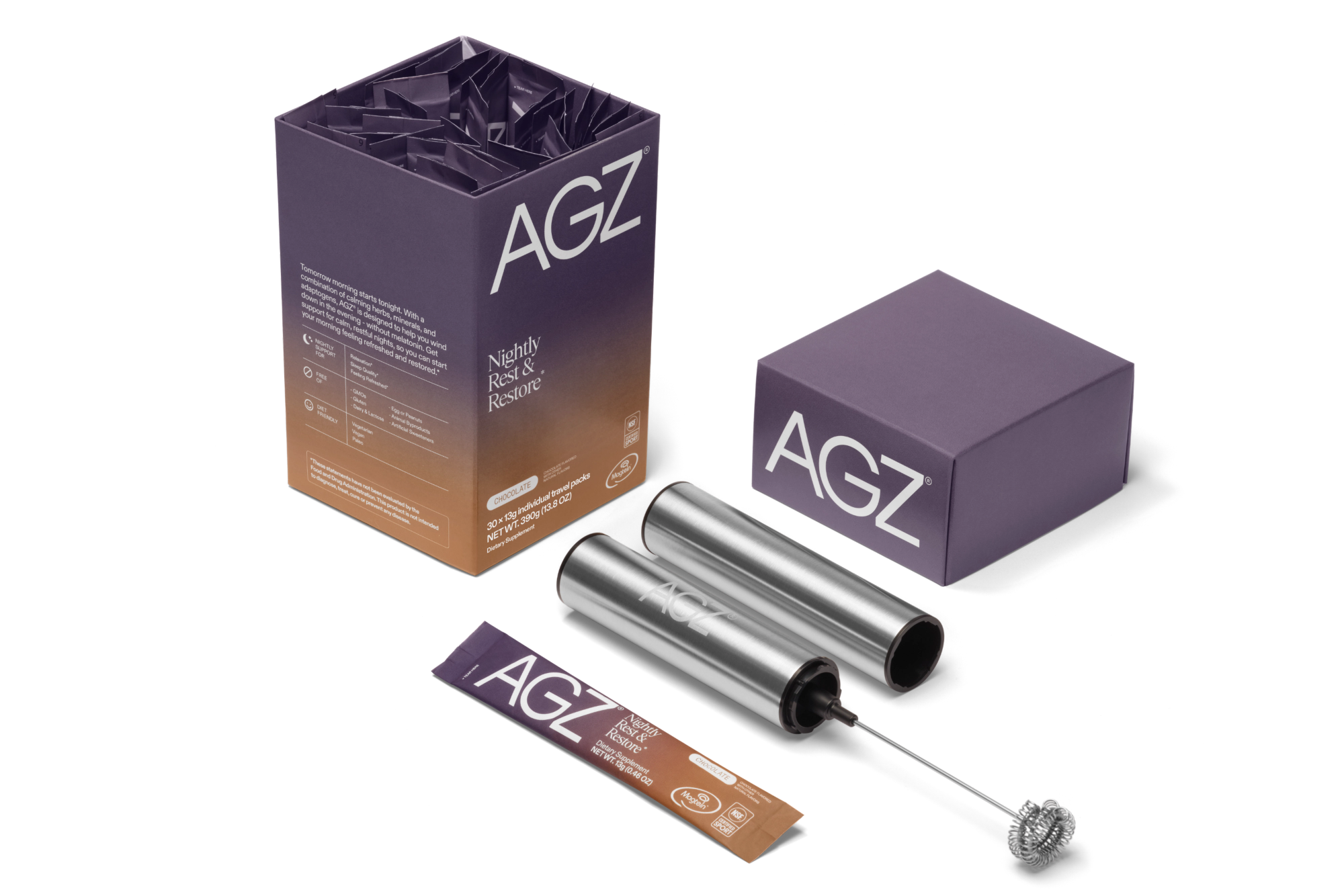 — Add one pack of AGZ to 4 ounces of water or milk. Experiment with warm or cold temperatures to find what’s best for your nighttime ritual.