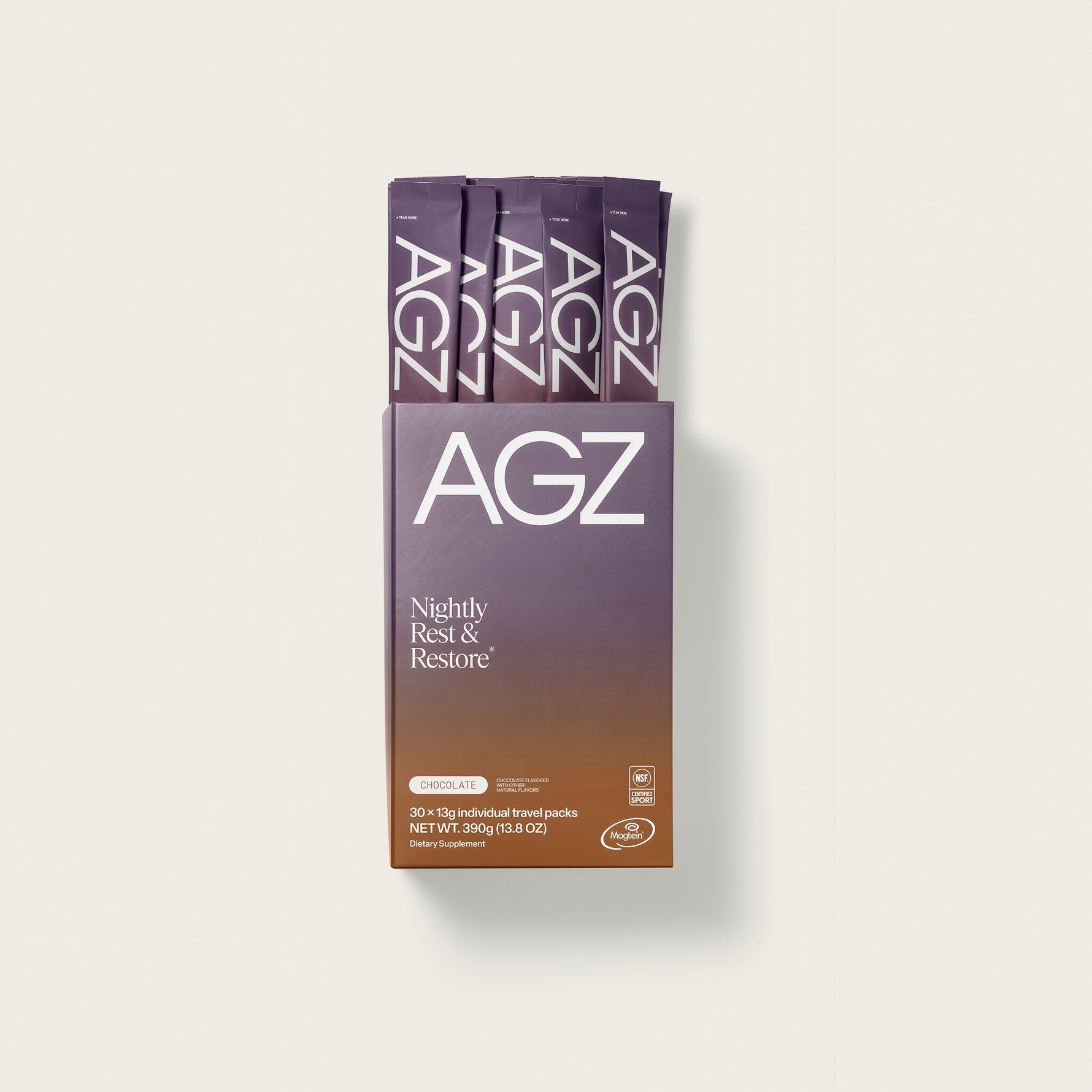 — Add one pack of AGZ to 4 ounces of water or milk. Experiment with warm or cold temperatures to find what’s best for your nighttime ritual.