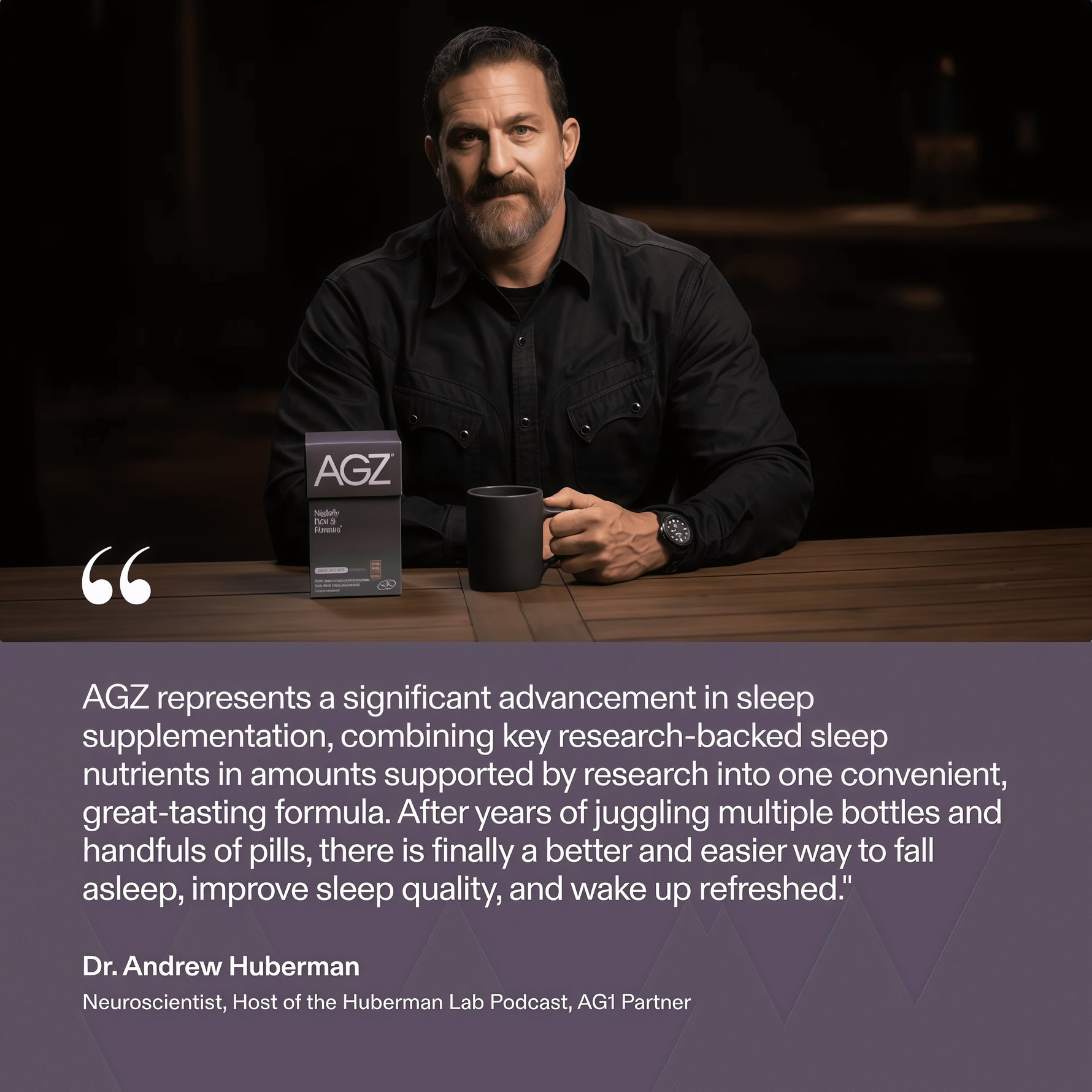 "AGZ represents a significant advancement in sleep supplementation, combining key research-backed sleep nutrients in amounts supported by research into one convenient, great-tasting formula. After years of juggling multiple bottles and handfuls of pills, there is finally a better and easier way to fall asleep, improve sleep quality, and wake up refreshed."